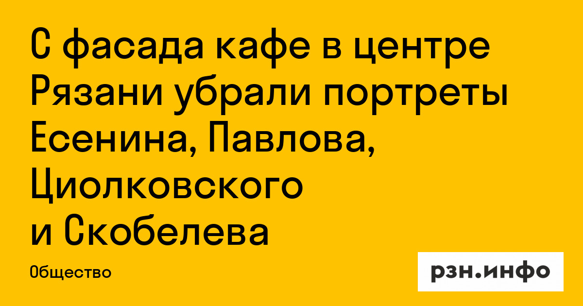 Кафе «Хорошие руки», которое находится в центре Рязани на улице Почтовая, исчезли портреты знаменитых горожан — Сергея Есенина, Ивана Павлова, Константина Циолковского и Михаила Скобелева. Теперь на их месте объявления про рыболовные снасти и телефон туристского центра. Как рассказал корреспонденту РЗН. инфо руководитель кафе Александр Сомов, портреты убрали сотрудники кафе, таким образом они выполнили предписание государственной инспекции по охране объектов культурного наследия.