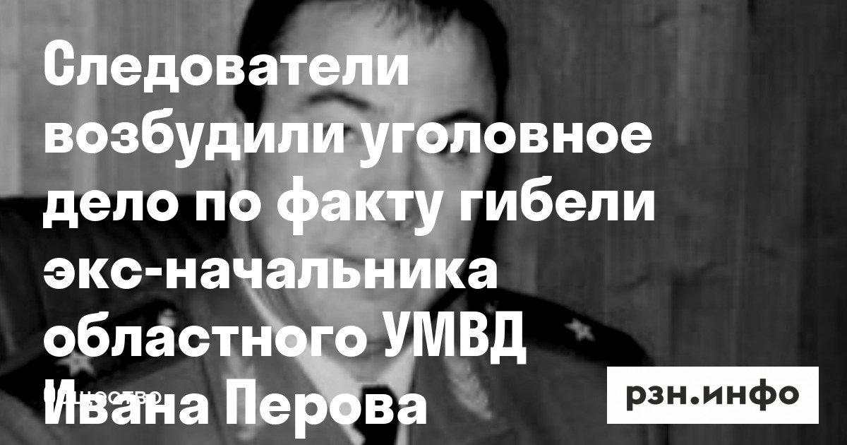 Следственное управление С. К. России по Рязанской области возбудило уголовное дело по статье 110 УК РФ «Доведение до самоубийства» по факту гибели бывшего начальника регионального УМВД Ивана Перова. Об этом в понедельник, 9 августа, РЗН. инфо сообщили в областном следкоме.