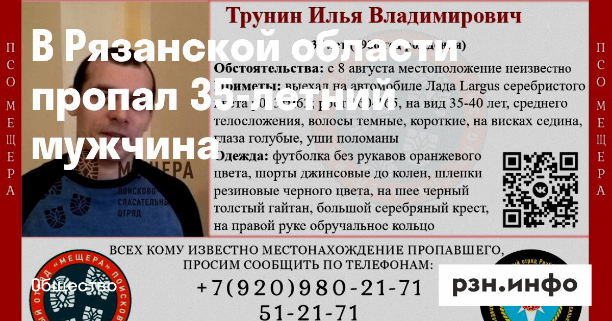 В Рязанской области пропал 35-летний Илья Владимирович Трунин. Об этом в рязанском поисково-спасательном отряде «Мещера».
