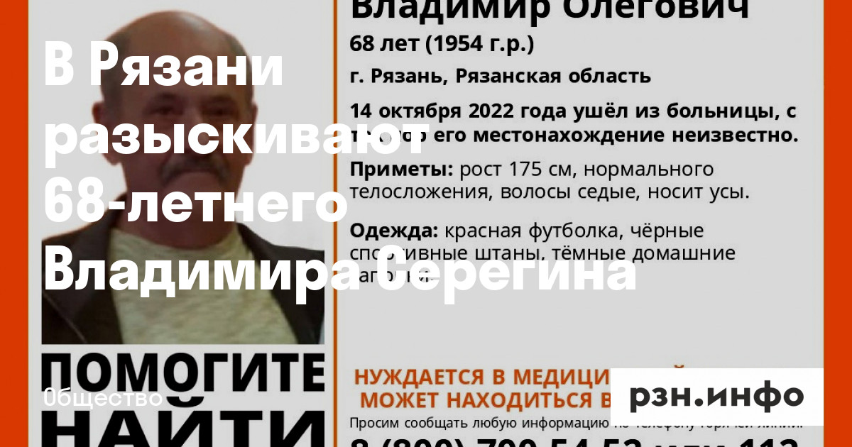 В Рязани пропал 68-летний мужчина. Ориентировку на поиск Владимира Серегина в пятницу, 14 октября, опубликовал поисково-спасательный отряд «Лиза Алерт».