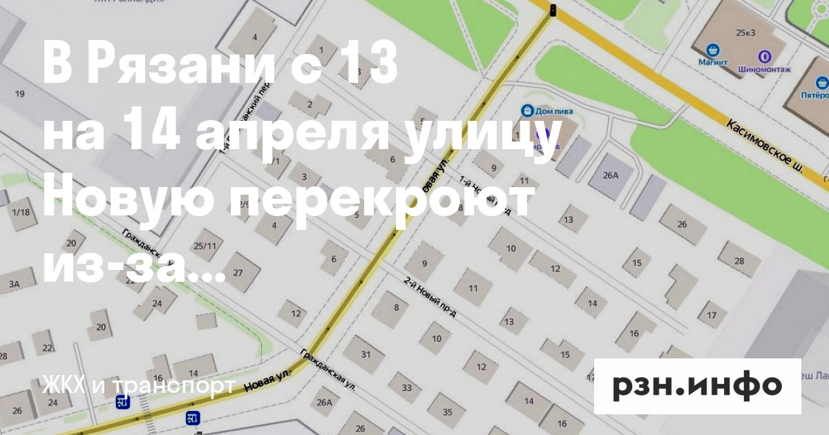 В Рязани с 13 на 14 апреля улицу Новую перекроют из-за ремонтных работ на водопроводе. Об этом на сайте мэрии.
