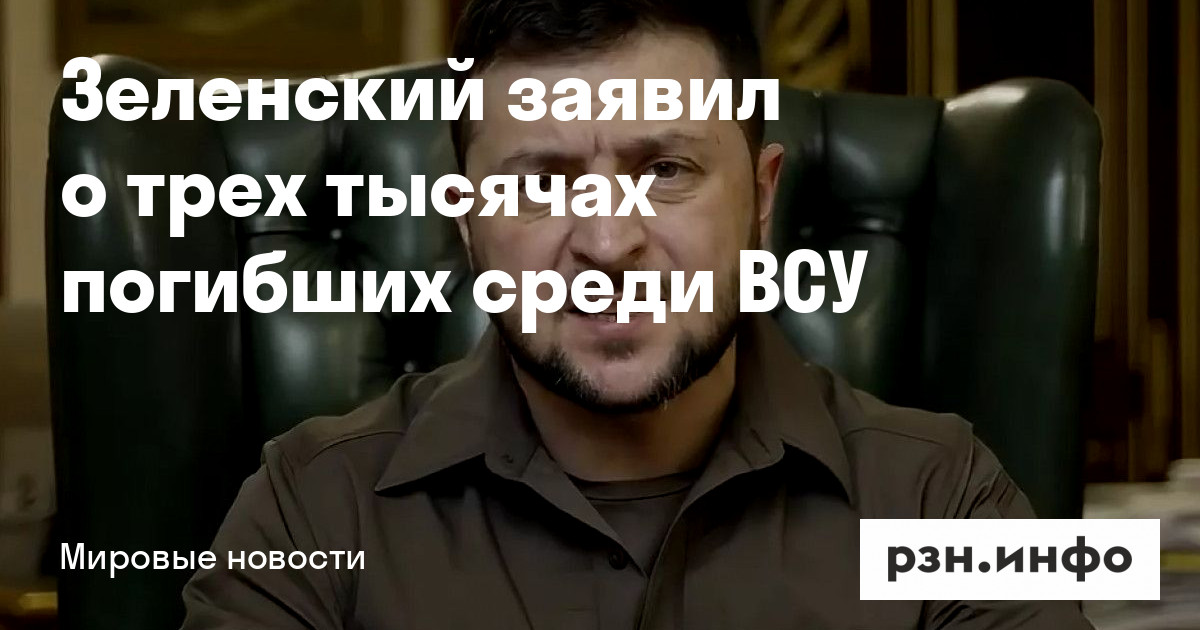 Президент Украины Владимир Зеленский заявил, что в ходе российской спецоперации погибли около трех тысяч украинских военнослужащих. Об этом он сообщил телекомпании CNN.