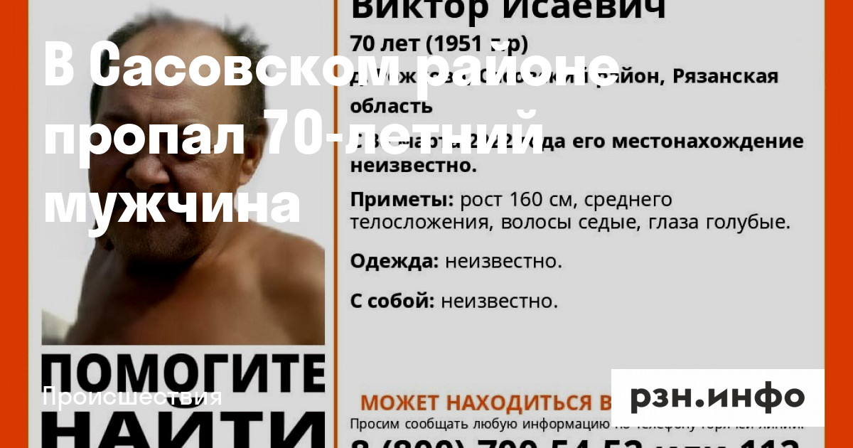 В деревне Рожково Сасовского района пропал 70-летний Виктор Исаевич Дунин. О поисках сообщили волонтеры отряда «ЛизаАлерт».