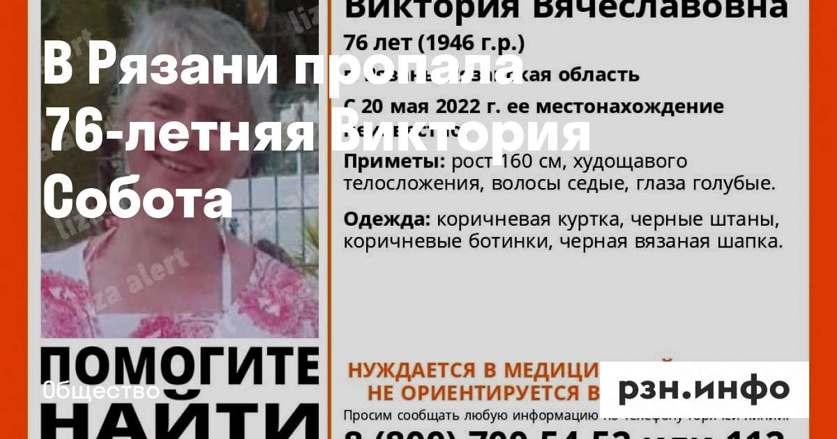 В Рязани пропала 76-летняя Виктория Собота. Об этом в пятницу, 20 мая, сообщил поисково-спасательный отряд «ЛизаАлерт».