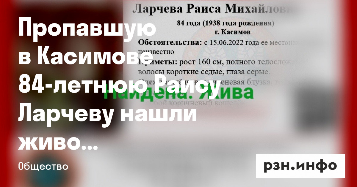Пропавшую в Касимове 84-летнюю Раису Ларчеву нашли живой. Об этом сообщили в поисково-спасательном отряде «Мещера».