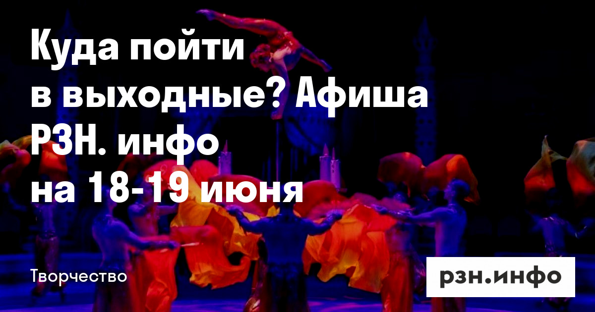 В цирке продолжаются гастроли шоу «Песчаная сказка» от «Королевского цирка Гии Эрадзе». Вместе с артистами зрители совершат путешествие в самое сердце Востока. Контраст холодных ночей пустыни и упоительного тепла оазиса, юмор, музыка и чудеса создают яркое сказочное шоу. В клубе Deep 18 июня с сольным концертом выступит Леша Свик — яркий хитмейкер современной музыки, автор треков «Малиновый свет», «Ей нравятся», «Дым», «Самолеты» и других. Закрывает очередной сезон рязанский Театр кукол. В ближайшие выходные состоятся заключительные спектакли — 18 июня «Дюймовочка», 19 июня — «Теремок». А в пабе «Две будки в Ирландии» 19 июня рязанские музыканты исполнят свои версии песен Юрия Визбора.