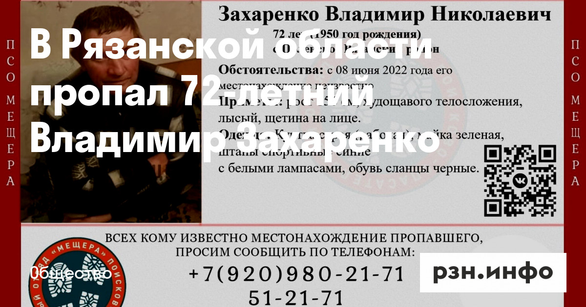 В Рязанской области пропал 72-летний Владимир Захаренко. Об этом сообщил .