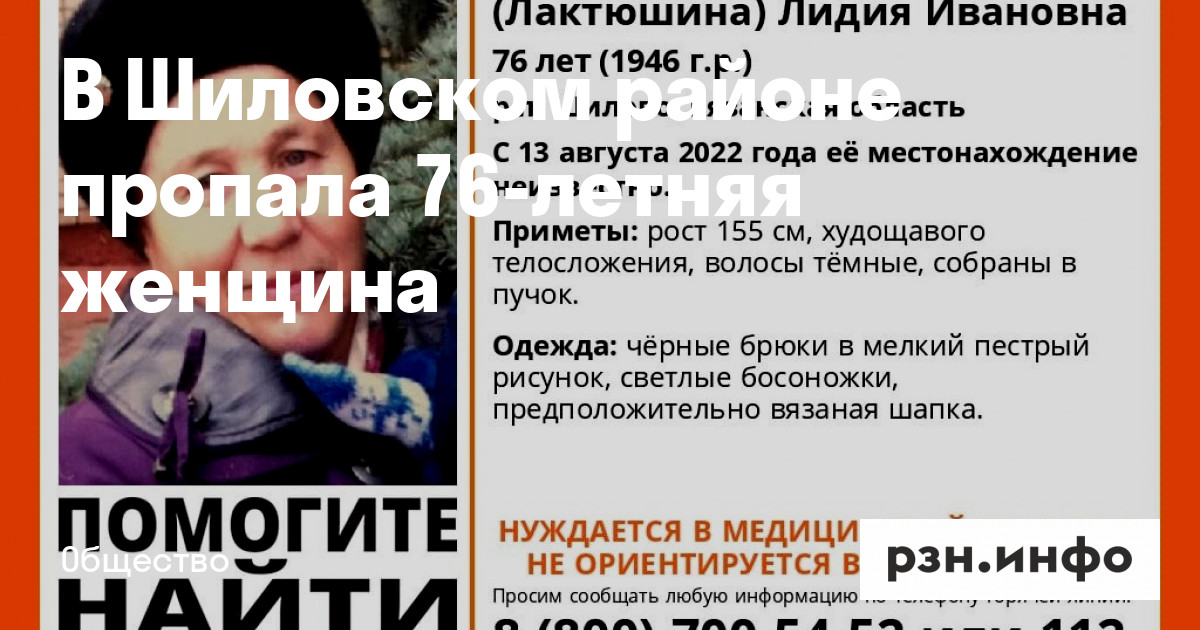 Женщина 1946 года рождения пропала в Шилове. О ней ничего неизвестно с 13 августа.