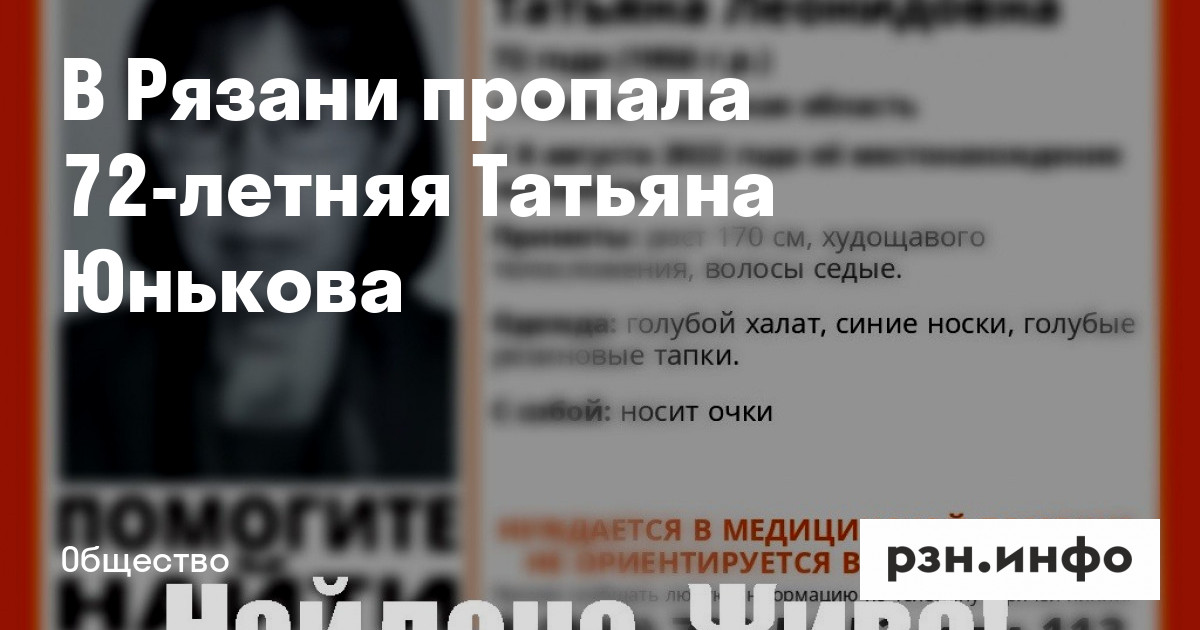 В Рязани пропала 72-летняя Татьяна Юнькова. Об этом сообщило поисково-спасательный отряд «ЛизаАлерт».