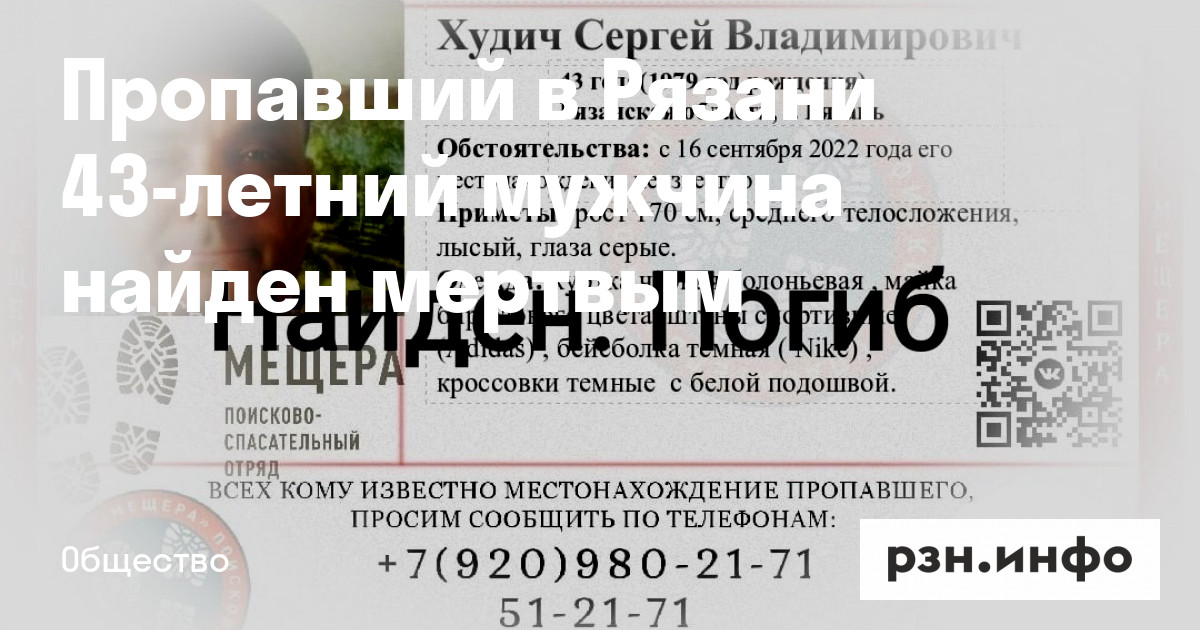 Пропавший в Рязани 43-летний мужчина найден мертвым. Об этом волонтеры поисково-спасательного отряда «Мещера» в понедельник, 19 сентября.