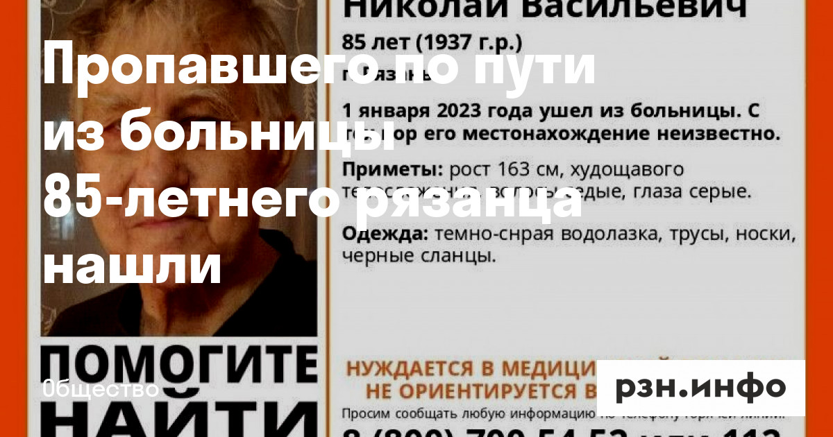 Пропавшего по пути из больницы 85-летнего рязанца нашли