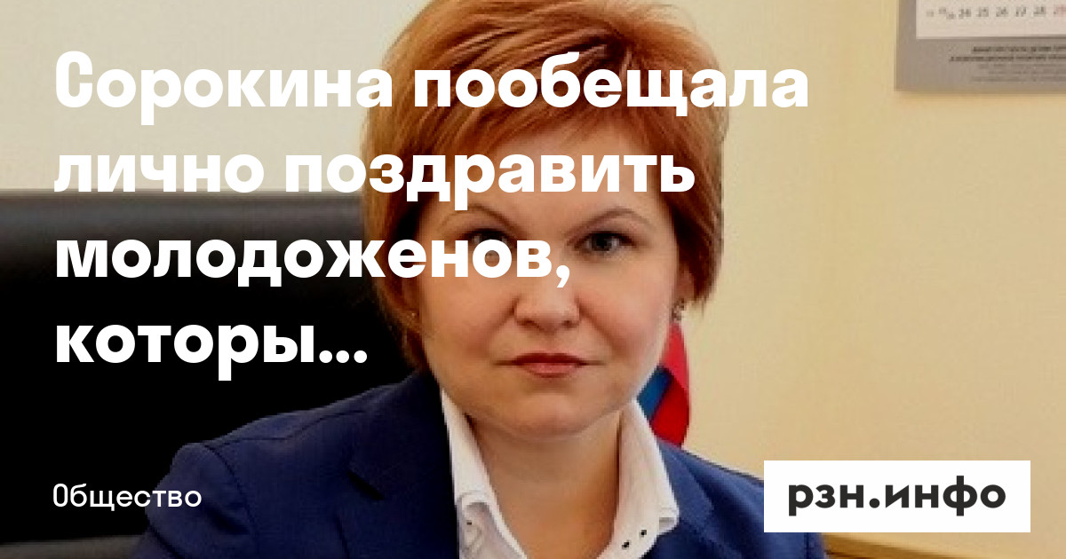 Экс-мэр Рязани, а сейчас руководитель Управления ЗАГС региона Елена Сорокина пообещала лично поздравить молодоженов, которые зарегистрируют брак 31 декабря. Об этом она рассказала в прямом эфире Центра управления регионом в среду, 29 ноября.