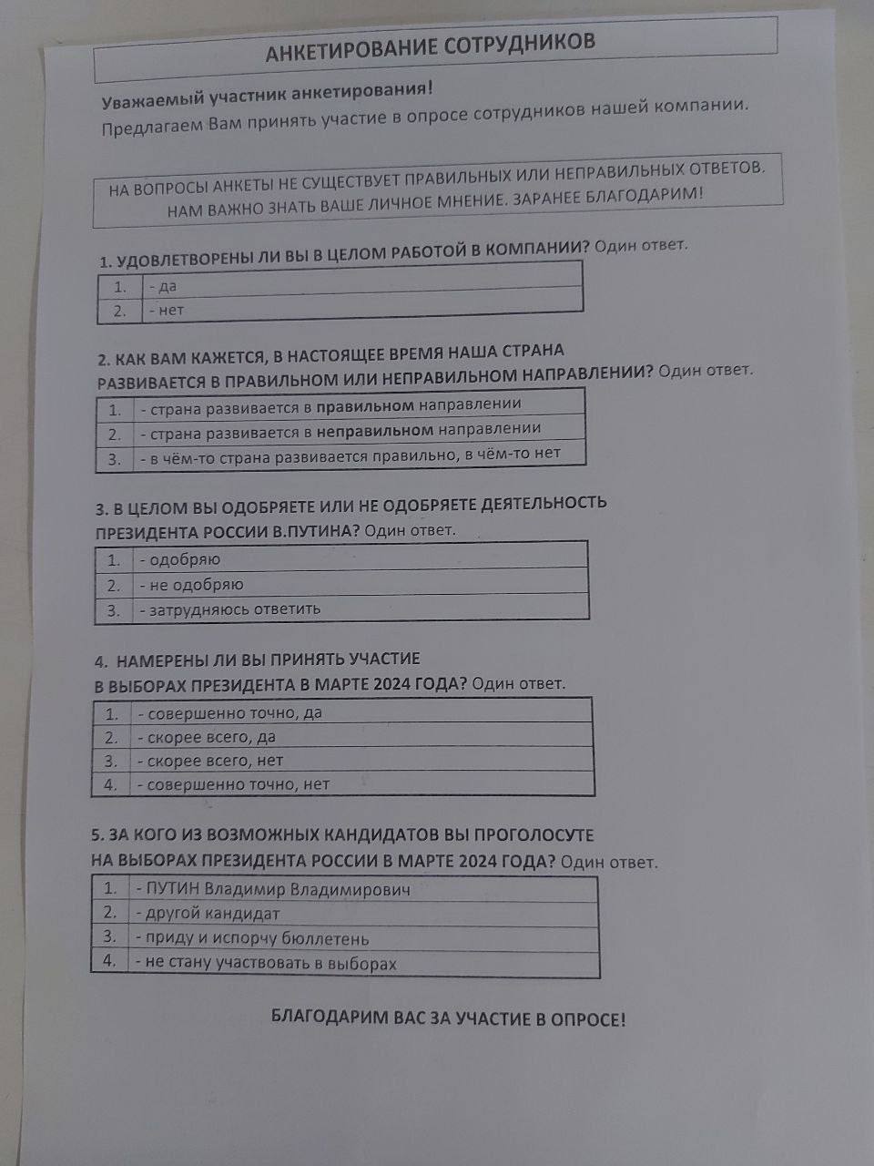 В анкетах пять вопросов: удовлетворены ли работой в компании, хорошо ли развивается страна, одобряете ли деятельность Путина, примете ли вы участие на выборах президента в 2024 году и если да, то за кого проголосуете.