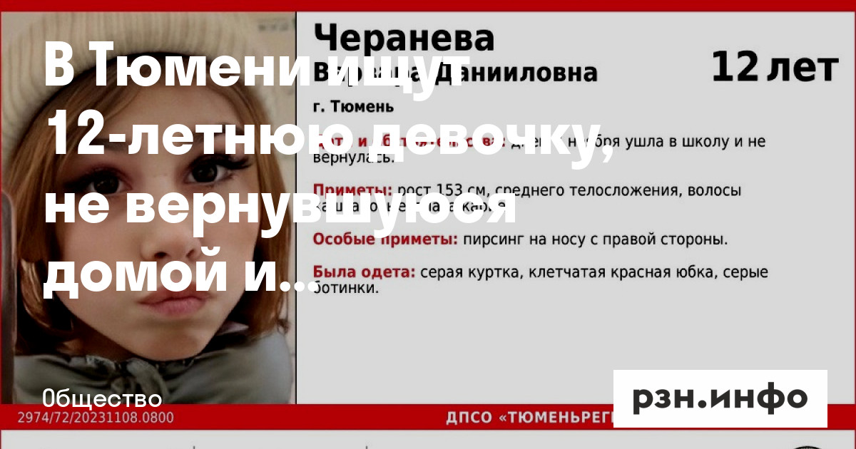 В Тюмени пропала 12-летняя девочка. Она не вернулась домой после школы, пишет со ссылкой на городской поисковый отряд «ТюменьРегионСпас».