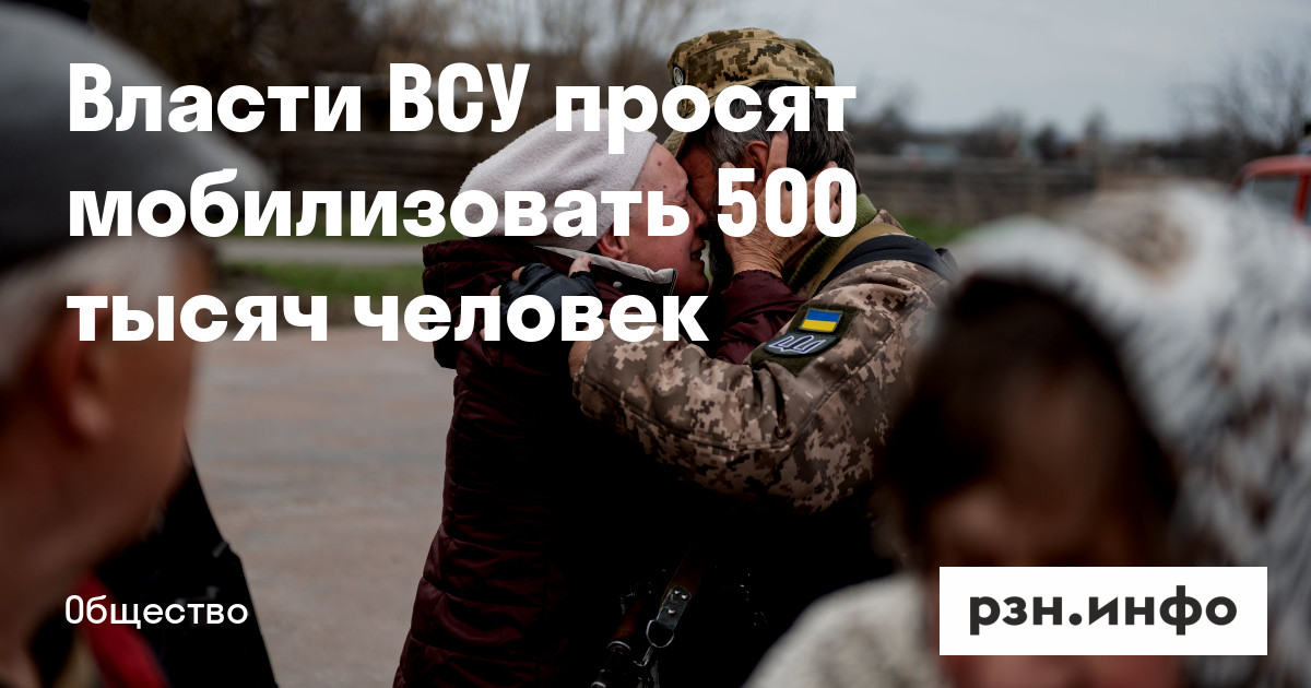 Президент Украины Владимир Зеленский сообщил, что власти ВСУ попросили у него мобилизовать еще до полумиллиона человек. Об этом пишет РЕН ТВ.