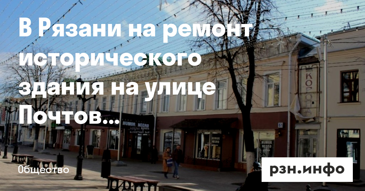 В Рязани на ремонт исторического здания на улице Почтовой, дом № 61 выделили 12,4 миллиона рублей. Тендер разместили на сайте госзакупок.