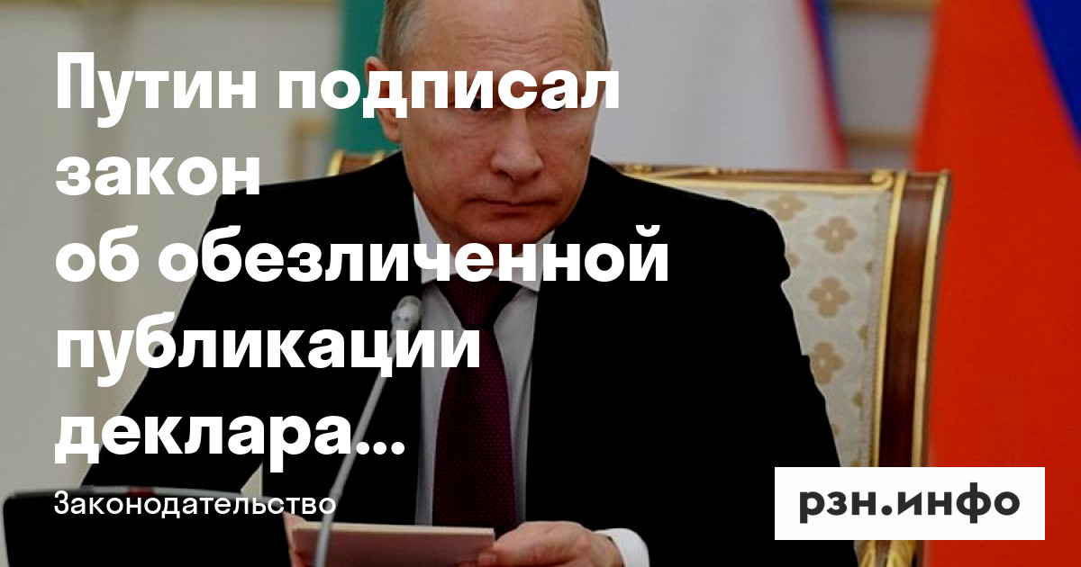 Президент России Владимир Путин подписал закон об обезличенной публикации деклараций депутатов и сенаторов. Документ опубликовали на официальном портале правовой информации, пишет .