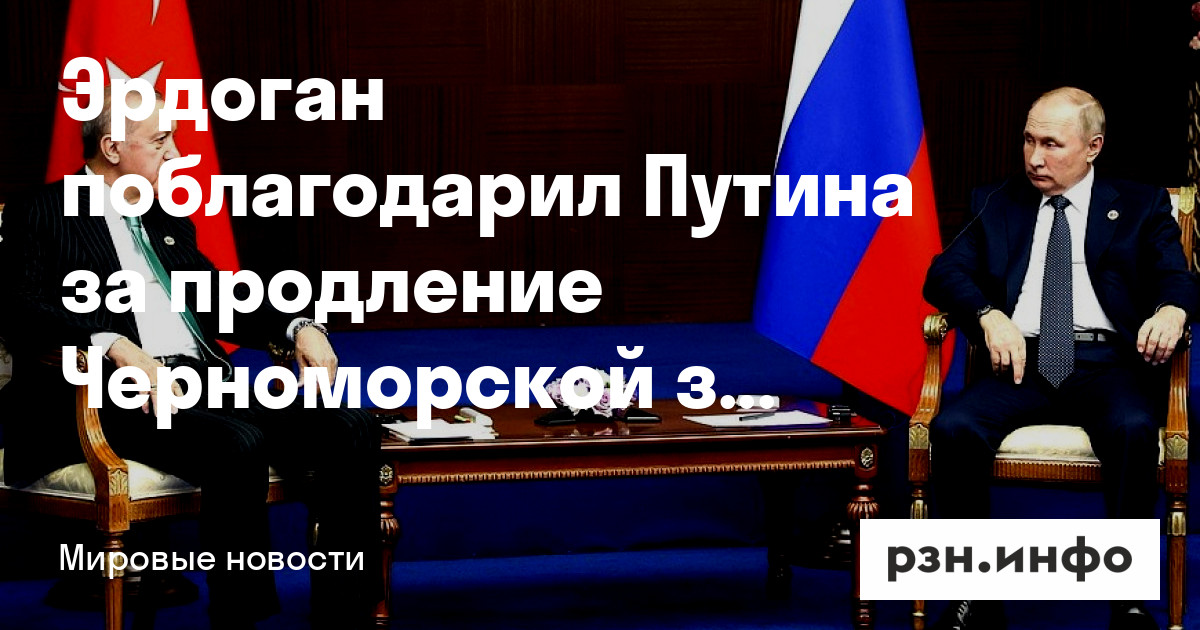 Президент Турции Реджеп Эрдоган поблагодарил своего коллегу из России Владимира Путина за продление Черноморской зерновой сделки. Об этом 25 марта пишет РИА Новости.