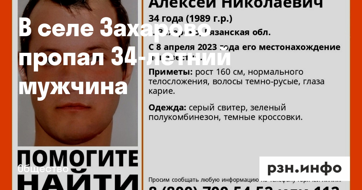 В Рязанской области в селе Захарово пропал Алексей Николаевич Кулаков 1989 года рождения. С 8 апреля 2023 года местонахождение мужчины неизвестно. О поисках сообщили волонтеры
