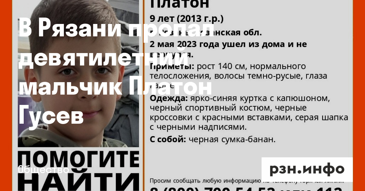 В Рязани 2 мая пропал девятилетний мальчик Платон Гусев. Об этом сообщает региональное отделение «Лизы Алерт».