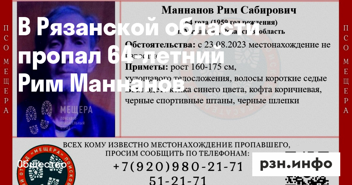 В Рязанской области пропал 64-летний Рим Маннанов. Об этом сообщили волонтеры поисково-спасательного отряда «Мещера».