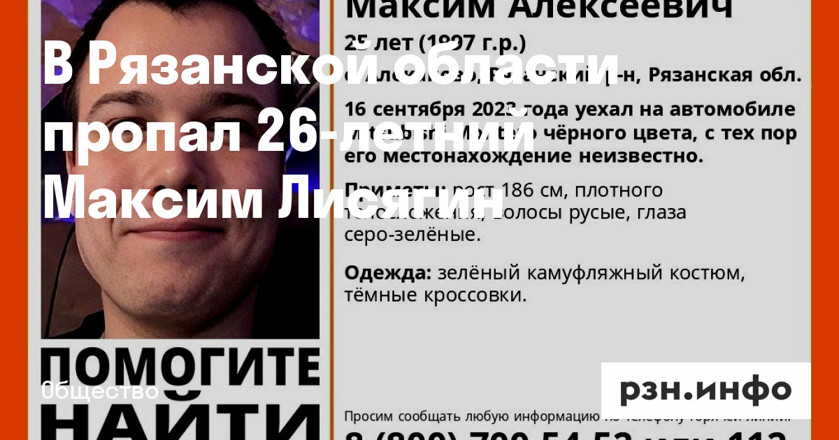 В Рязанской области пропал 26-летний Максим Лисягин. Об этом сообщил поисково-спасательный отряд «ЛизаАлерт».