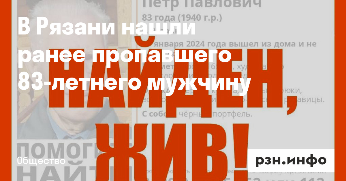 В Рязани нашли живым ранее пропавшего 83-летнего Петра Павленко. Об этом сообщили в ПСО «Лиза Алерт».