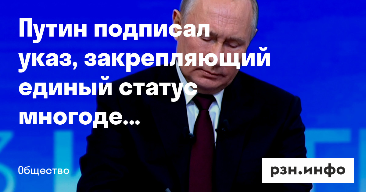 Президент России Владимир Путин подписал указ, который на федеральном уровне закрепляет статус многодетных семей и определяет меры поддержки для них. Соответствующий документ опубликован на официальном портале правовой информации, пишет ТАСС.