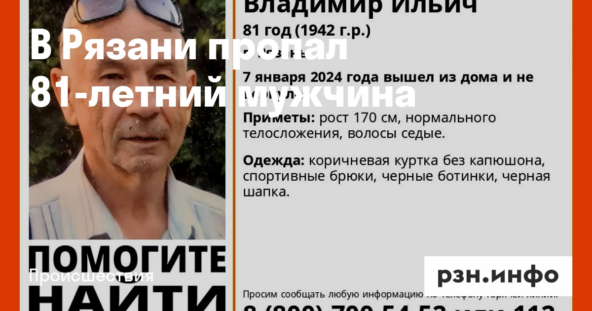 В Рязани пропал Владимир Ильич Андреев 1942 года рождения. В воскресенье, 7 января, он вышел из дома и не вернулся, сообщают волонтеры «ЛизаАлерт».