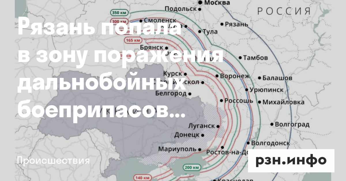 На инфографике, опубликованной изданием, видно, что Рязань попадает в зону поражения дальнобойных боеприпасов ВСУ после разрешения США, Франции и Британии нанести удар вглубь российской территории с помощью ракет ATACMS/SCALP/Storm Shadow.