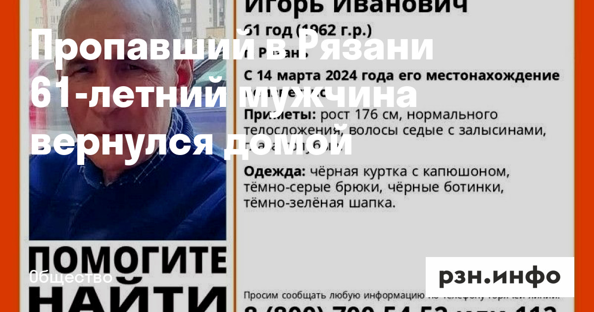 Пропавший в Рязани 61-летний мужчина вернулся домой. Об этом редакции РЗН. Инфо сообщили его родственники.