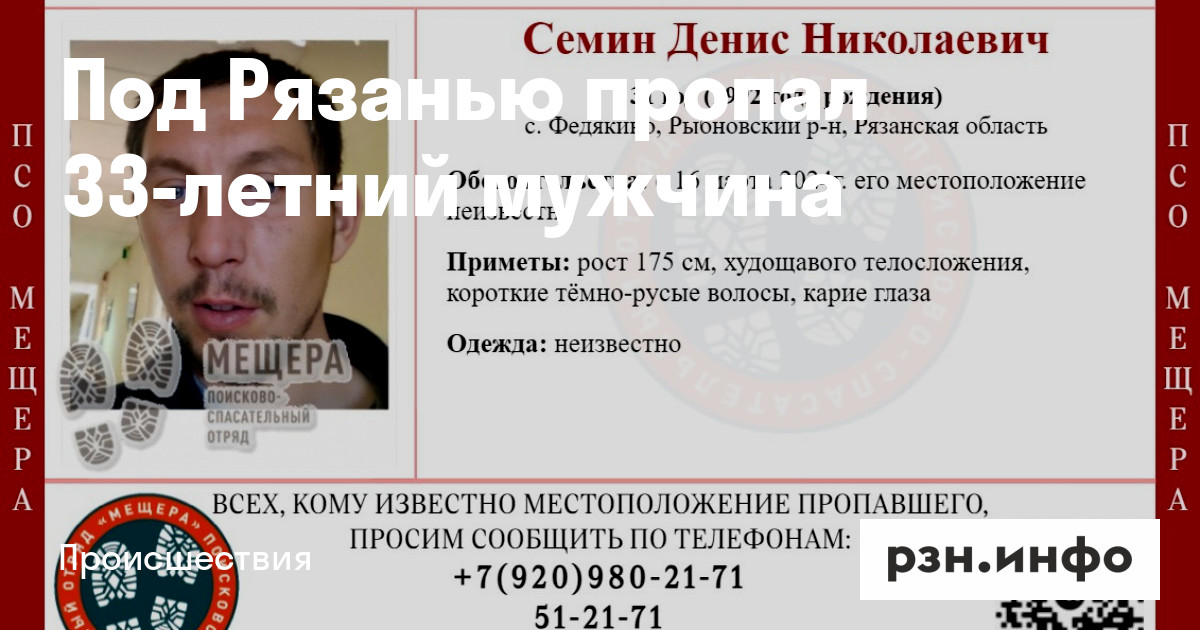 Денис Семин из села Федякин в Рыбновском районе пропал 16 марта.