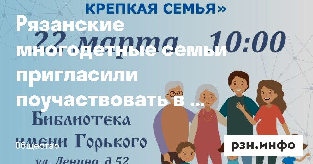 Рязанские многодетные семьи пригласили поучаствовать в мастер-классах во время всероссийского форума «Рязанская семейная губерния — крепкая семья». Как сообщает региональный минсоц, мероприятие пройдет в библиотеке имени Горького в пятницу, 22 марта.