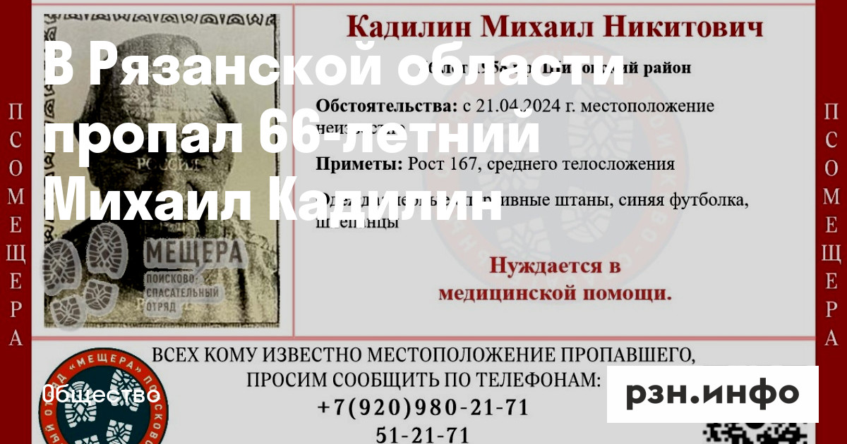 В Рязанской области пропал 66-летний Михаил Кадилин. Об этом сообщает ПСО «Мещера».