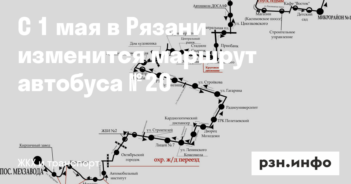 С 1 мая в Рязани изменится маршрут автобуса № 20. Об этом в пятницу, 26 апреля, сообщило МУП «Управление Рязанского троллейбуса».