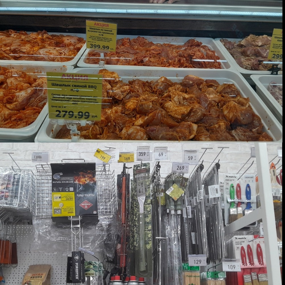 Самый дешевый для покупки шашлыка магазин — «Пятерочка». За счет праздничных скидок в нем самое выгодное мясо, но при этом небогатый выбор мангалов. Самый дорогой магазин — «Перекресток». Выбор мяса не поражает разнообразием, на прилавке не оказалось жидкости для розжига, а мангалы стоят на порядок дороже, чем в других точках. В «Европе» самый богатый выбор мяса для шашлыка, большой выбор мангалов и шампуров — от самых простых до навороченных.