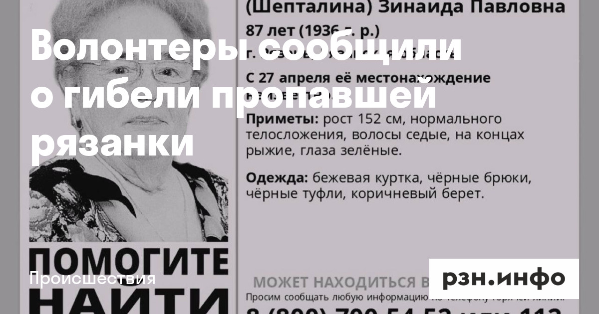 Волонтеры сообщили о гибели пропавшей рязанки