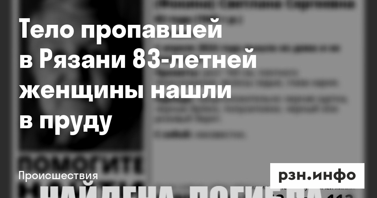 Ранее сообщалось, что в Рязани пропавшая 83-летняя женщина погибла. Ее местонахождение не было известно со 2 апреля.