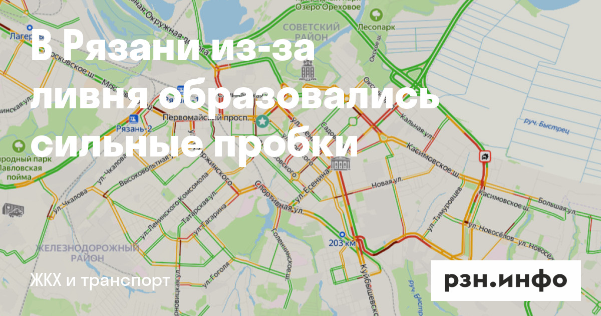 В Рязани из-за ливня образовались сильные пробки. Об этом свидетельствуют данные сервиса «Яндекс карты».
