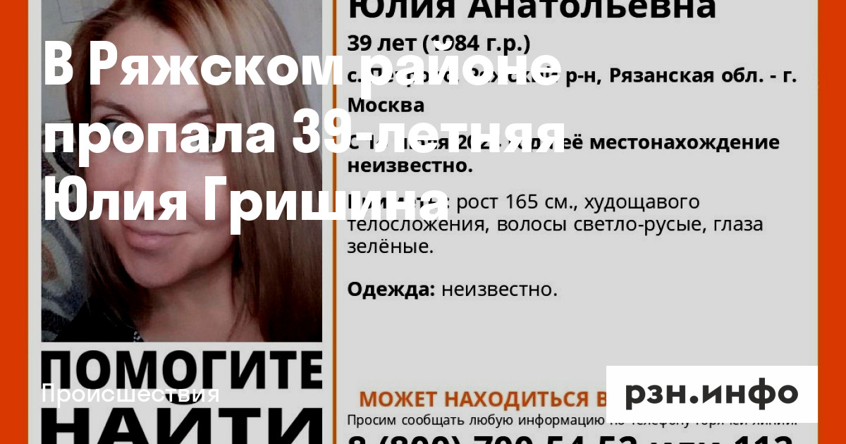 В Ряжском районе пропала 39-летняя Юлия Гришина. Об этом сообщает ПСО «ЛизаАлерт».