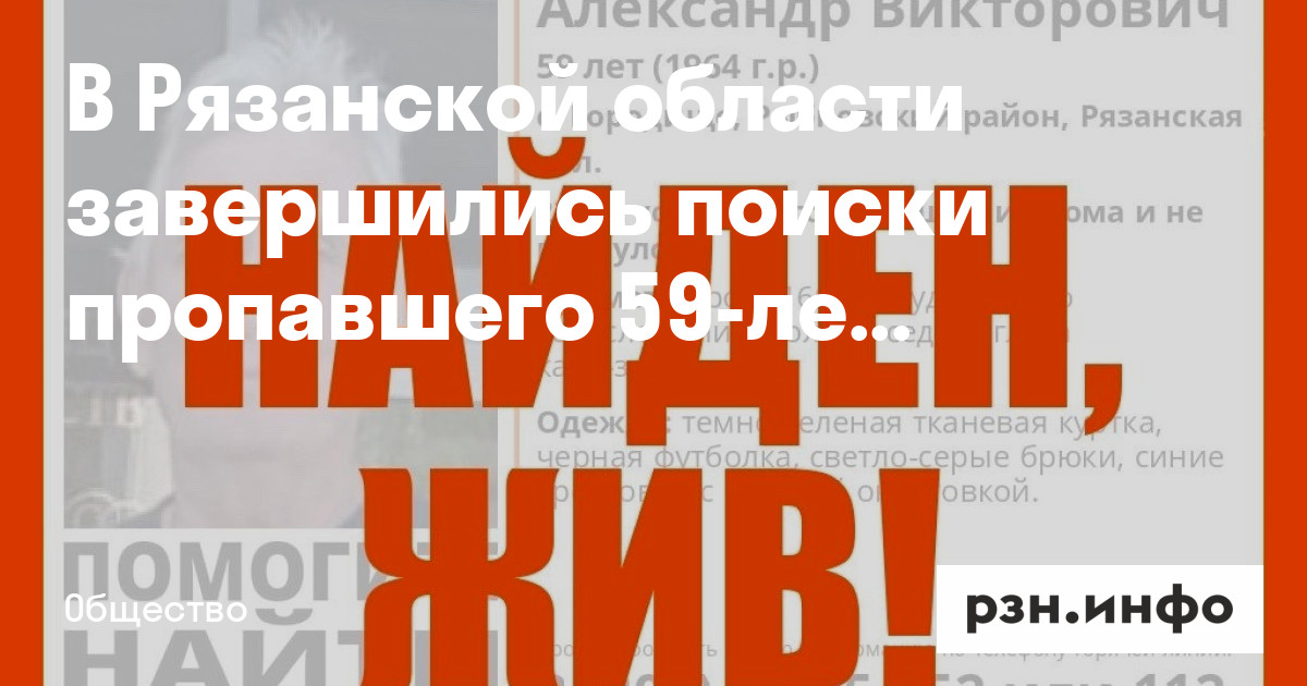 59-летний Александр Феоктистов из села Городище в Рыбновского районе был найден живым. Подробности поисков неизвестны.