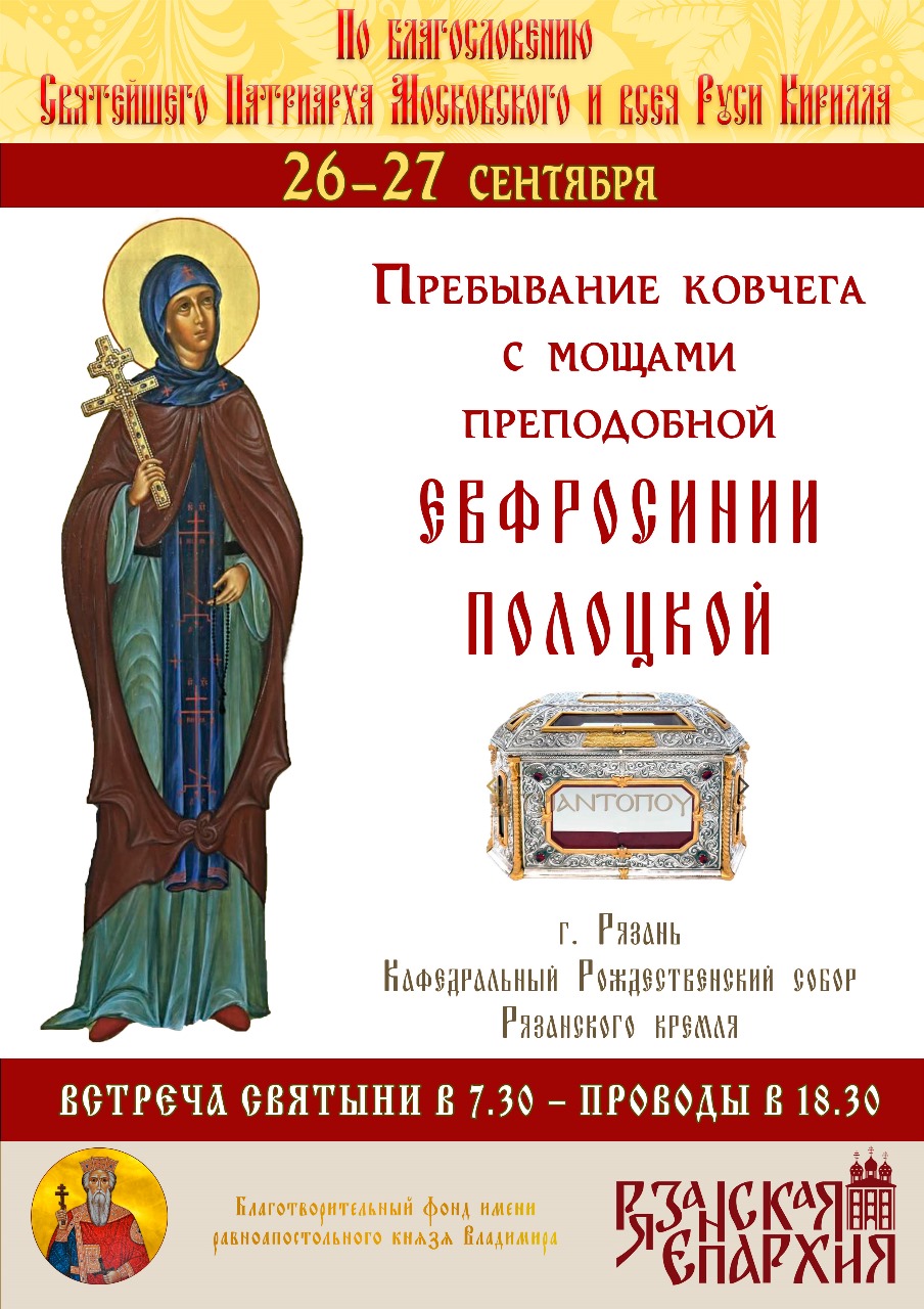 В Рязань 26 сентября прибудут мощи преподобной Ефросинии Полоцкой. Об этом сообщила пресс-служба епархии.