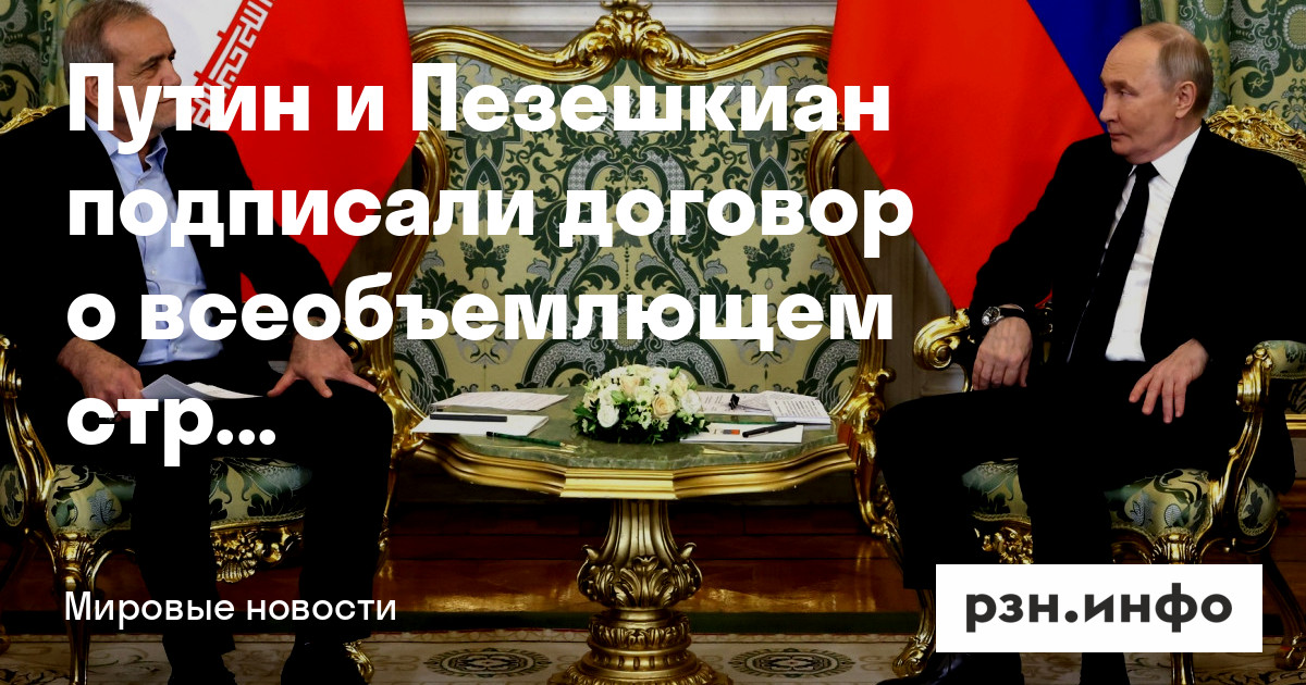 Президенты России и Ирана Владимир Путин и Масуд Пезешкиан после переговоров в Кремле подписали договор о всеобъемлющем стратегическом партнерстве двух стран. Об этом 17 января корреспондент РИА Новости.
