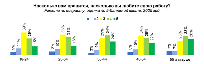 За год в регионе существенно выросла доля тех, кто ставил своей работе «пятерку», то есть, действительно любит то, чем занимается — с 11% в 2024 до 22% в 2025 году. Но при этом выросла и доля тех, у кого отношение к работе «на троечку» с 23% до 30%.