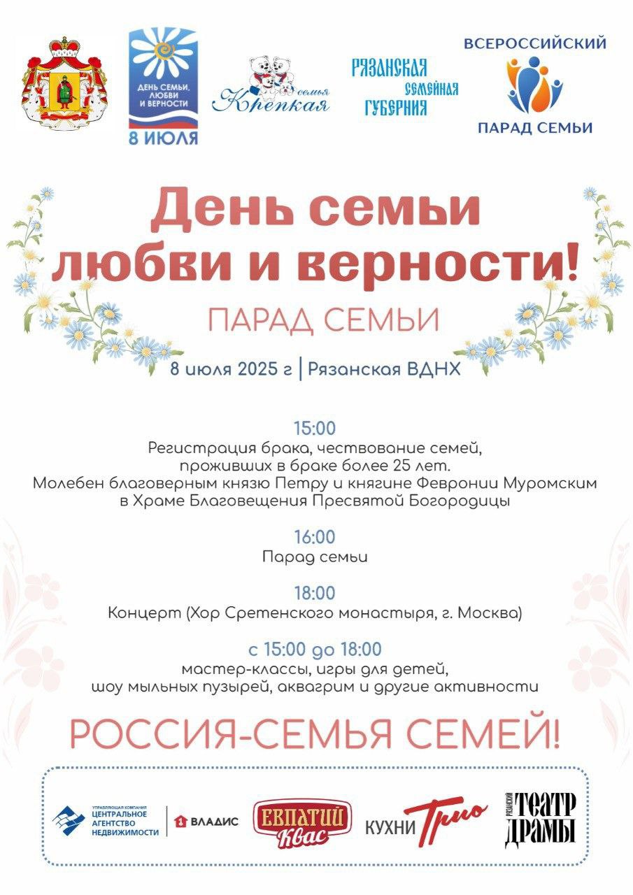 Отмечается, что праздничное мероприятие состоится на Рязанской ВДНХ. Начало в 15.00. В программу войдут поздравления заслуженных семей, специалисты Дворца торжеств проведут церемонии бракосочетания. Будут работать мастер-классы, интерактивные площадки, выставки. В 18.00 выступит хор Сретенского мужского монастыря.
