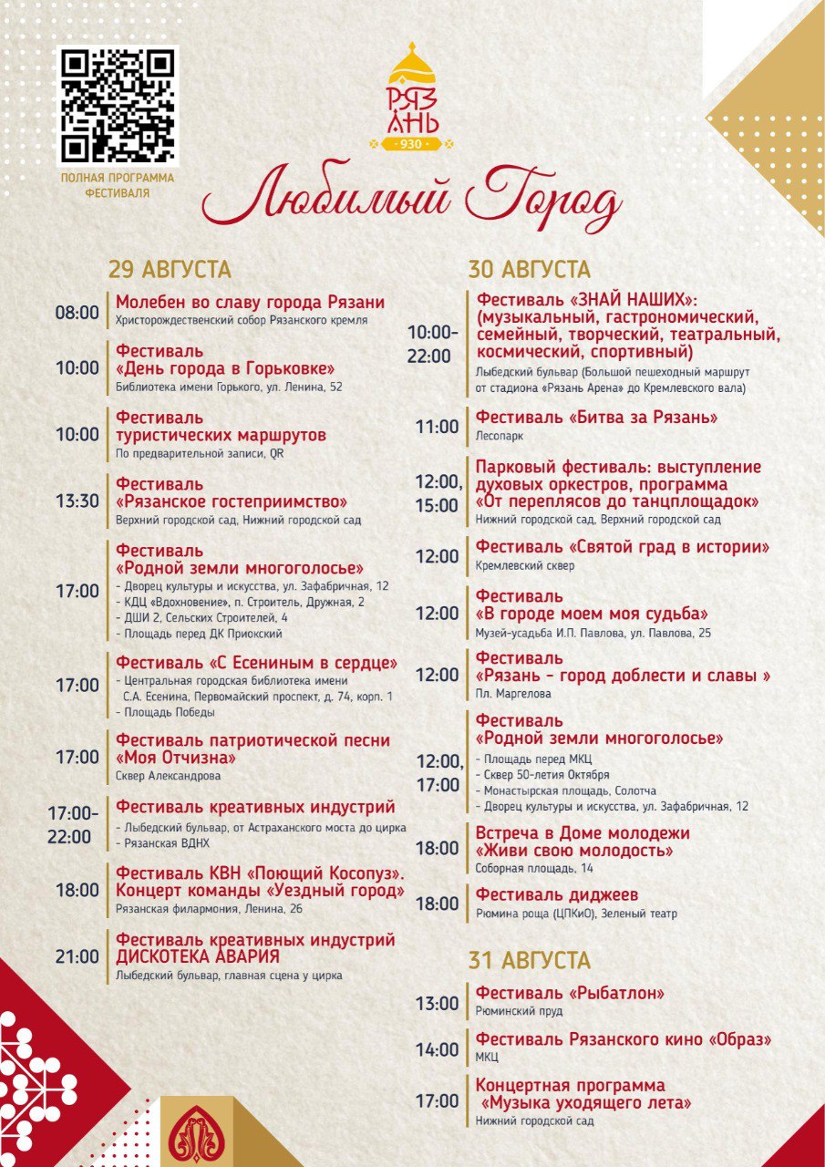 Мероприятия пройдут 29, 30 и 31 августа, а также 5 сентября. Глава управления культуры администрации Рязани Надежда Майорова рассказала, что 29 августа начнется с традиционного молебна во славу Рязани в Христорождественском соборе Рязанского кремля. Запланировано более 20 фестивалей, главной площадкой станет Лыбедский бульвар.
