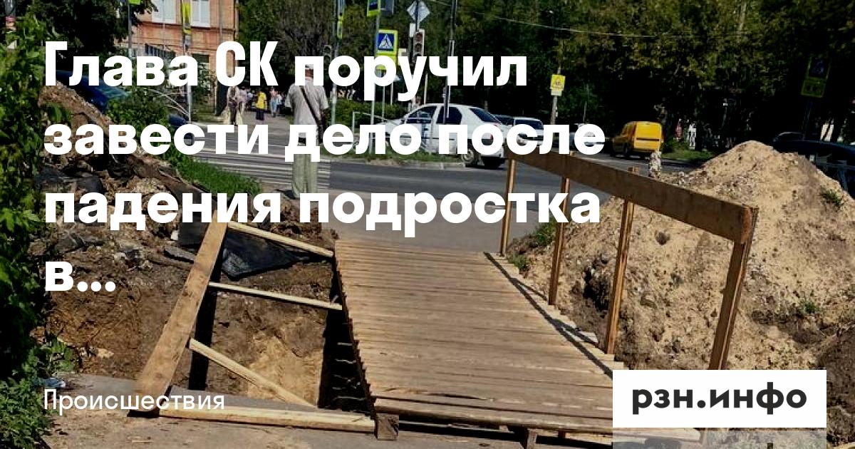 Инцидент произошел 4 августа. На пересечении улиц Весенней и Высоковольтной проводился ремонт теплотрассы. Перила обрушились, после чего 14-летний мальчик, находившийся в тот момент на переправе, упал в заполненную водой траншею. Пострадавшего с полученными повреждениями госпитализировали. Бастрыкин поручил руководителю СУ СКР по Рязанской области Олегу Васильеву возбудить уголовное дело и представить доклад. Исполнение поручения поставлено на контроль в центральном аппарате ведомства.