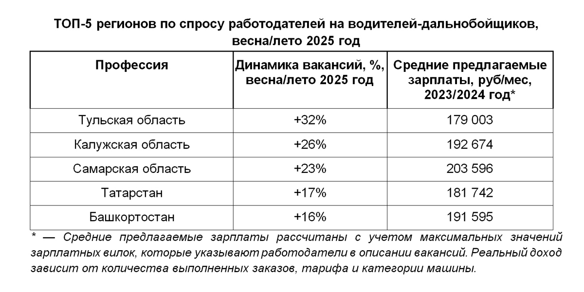 Самый высокий спрос на водителей дальнобойщиков зафиксирован в Тульской области, где количество вакансий увеличилось на 32%. Средняя предлагаемая зарплата в регионе составила 179 003 руб/мес. На втором месте оказалась Калужская область с приростом вакансий для водителей-дальнобойщиков на 26% и со средним предлагаемым доходом в 192 674 руб/мес. Топ-3 замыкает Самарская область (+23%), где работодатели предлагают кандидатам в среднем 203 596 руб/мес.