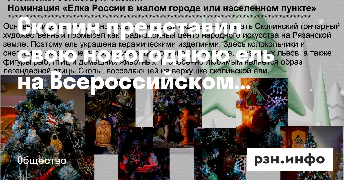 Скопин представил свою новогоднюю ель на Всероссийском конкурсе «Ёлки России». Об этом сообщили в сообществе ВКонтакте «ГородаМеняютсяДляНас». Уточняется, что номинация звучит как"Елка России в малом городе или населенном пункте". Скопинская ель украшена оригинальными изделиями местных мастеров. Каждый желающий может поддержать своего фаворита в онлайн-голосовании до 23:59 12 января. В финал пройдет проект, набравший наибольшее количество голосов среди 147 проектов данной номинации.