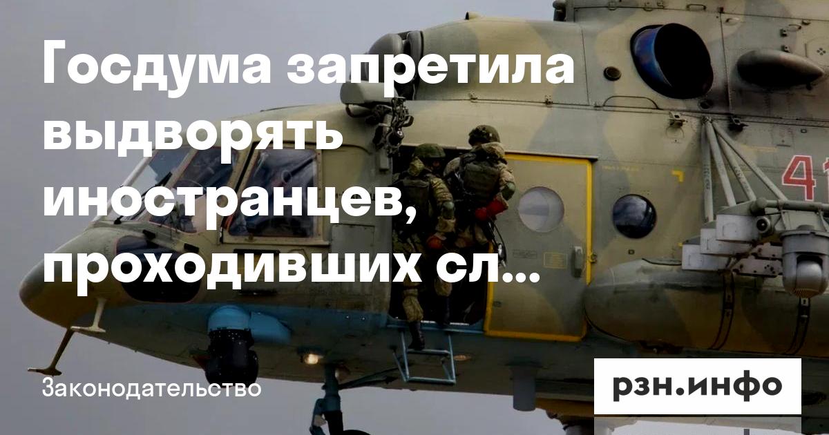 Госдума в третьем и окончательном чтении приняла закон, который запрещает административное выдворение из России иностранцев и лиц без гражданства, проходивших военную службу по контракту и участвовавших в боевых действиях в составе Вооруженных сил РФ. Об этом сообщили на сайте нижней палаты парламента.